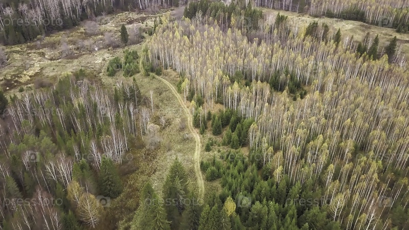Вид сверху сельской дороги, проходящей через осенний лес. Клип. Путешествие на автомобиле по лесной дороге в окружении цветных деревьев осени. Дорога проходит сквозь красивый лес с осенними деревьями