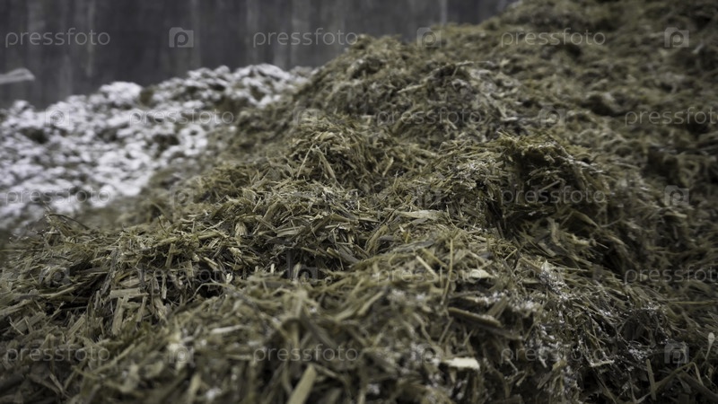 Ближе к куче старой травы и гумуса, подготовленного для удобрения почвы, концепция сельского хозяйства.Биомасса и мульча, органический материал на ферме