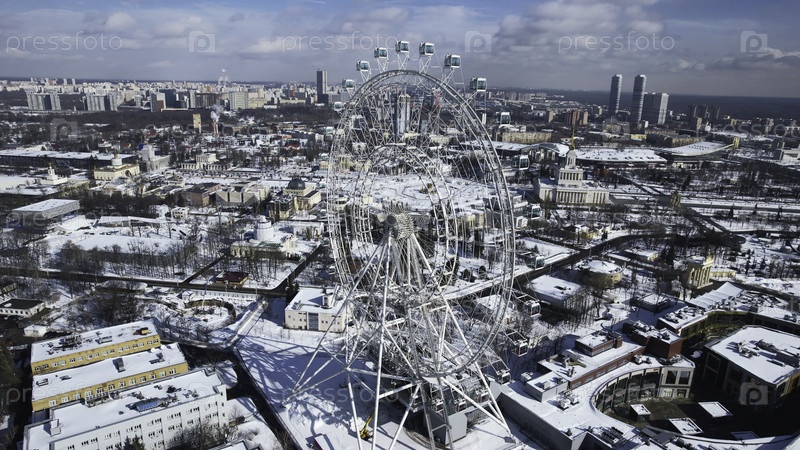 Вид сверху большого колеса обозрения зимой.Креативное.Прекрасный городской пейзаж с колесом обозрения в центре города зимой.Колесо обозрения в центре крупного города в солнечный зимний день
