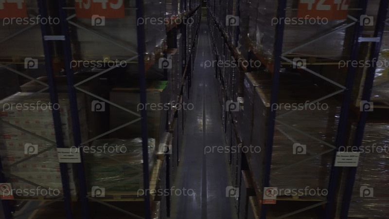 Хранилище с картонными коробками внутри на поддонах для паллет, логистический центр