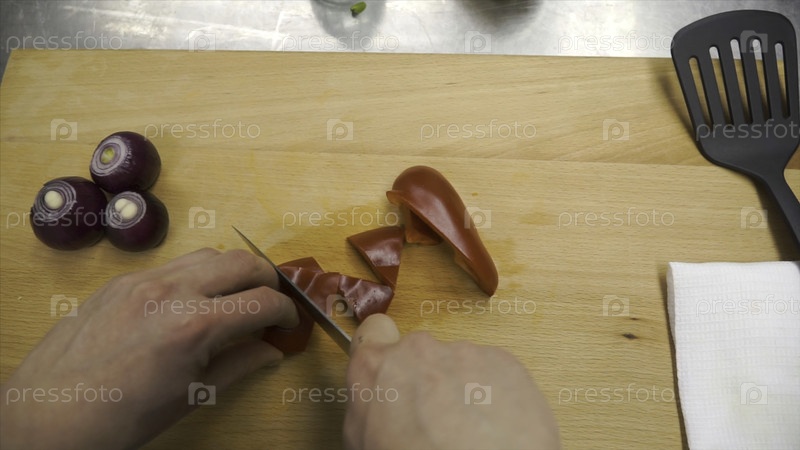 Нож разрезает красный перец на деревянной доске для резки. Клип. Резка ядра в сладком перце на деревянной доске. Удаление семян из красного свежего перца с помощью ножа. Приготовление овощей. Вид сверху. Нож срезает красный перец наполовину