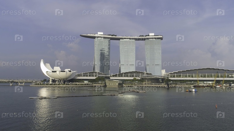 Авиафотография курорта Marina Bay Sands под облачным голубым небом в Сингапуре.Сингапурский горизонт и взгляд с воздуха на Марина-Бэй-Сэндс