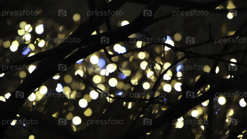 Близкий план ветвей деревьев в темноте с размытыми желтыми рождественскими огнями на заднем плане. Концепция. Прекрасный пейзаж праздников Рождества