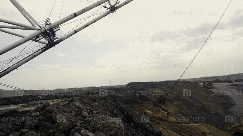 Потрясающий и обширный панорамный вид демонстрирует тяжелую технику, которая активно работает на открытой шахте