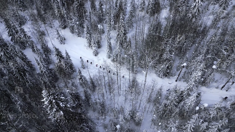 Вид с воздуха пешеходов в сосновом лесу, зимний ландшафт, французские Альпы. Клип. Концепция путешествий и активный образ жизни