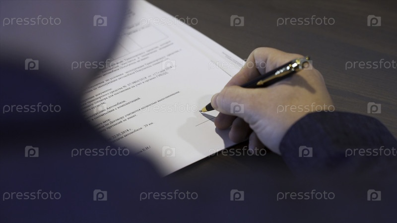 Сзади вид бизнесмена в черной рубашке, подписывающего контракт. Акции. Человек ставит свою подпись на важный документ