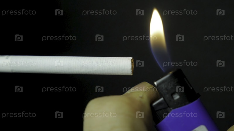 Ручная подсветка зажигалки сигареты крупный план. Горящая сигарета на черном фоне. Сигаретка близкий план на черном фоне