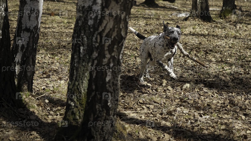 Игровой далматинец исследует красочный лес в приключениях
