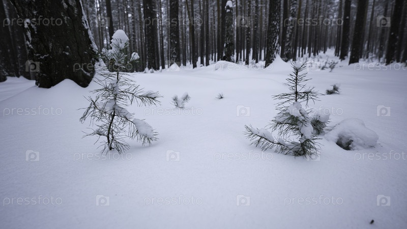 Вращающаяся камера в зимнем лесу. СМИ. Оглянись вокруг себя в диком лесу среди высоких деревьев и снежных заносов зимой. Маленькие елки в зимнем диком лесе