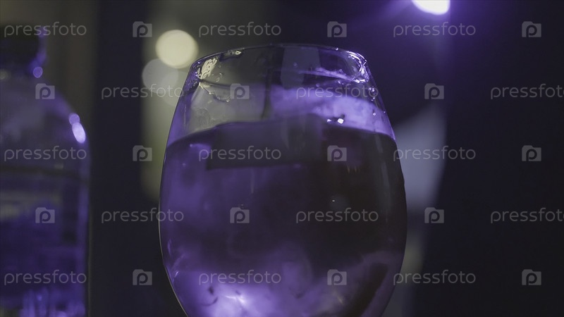 Закройте для стакана белого вина с кубиками льда, украшенными фрагментами цитрусовых на темном фоне
