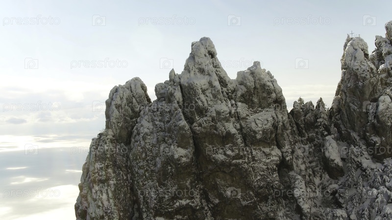 Ближе к резким скальным образованиям на фоне голубого облачного неба. Снимок. Аэрофотосъемка острых горных вершин и горизонтального изображения на заднем плане
