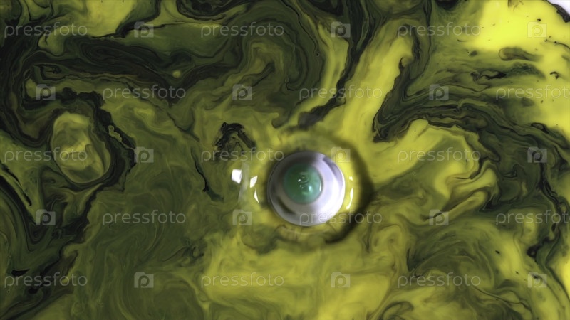 Красивая реакция на капли мыла, добавляемые к желтым и зеленым чернилам в молочной субстанции.Красоцветный фон жидких красок, движущихся по белой поверхности