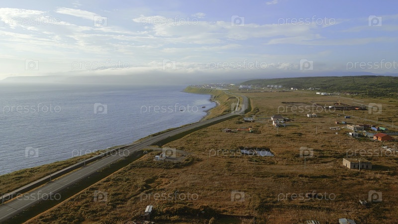 Вид сверху деревни с дорогой к морскому побережью. Клип. Морской пейзаж берега с дорогой и деревней в солнечный летний день. Прекрасный вид на побережье с городом и морем солнечным горизонтом