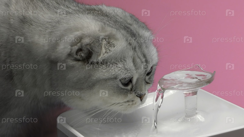 Белый красивый ухоженный кот. Акция. Домашний питомец, играющий с небольшим фонтаном на синем фоне