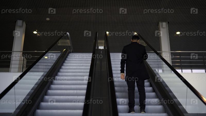 Пассажир едет по эскалаторам до станции наземного метро.СМИ.Задний вид молодого бизнесмена на эскалаторе