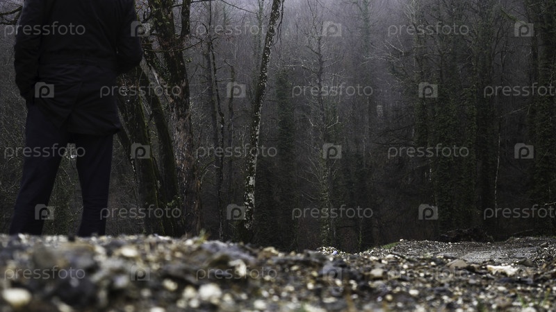 Сзади мужчина, стоящий перед осенним лесом под дождем.Холодная осенняя погода и туманные мокрые деревья под сильным дождем