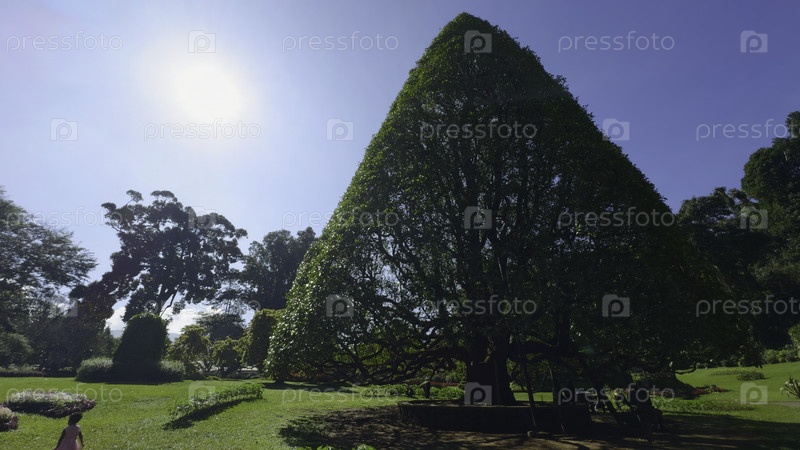 Обрезанное дерево в парке Акция Форма дерева в ухоженном городском парке в летний день Треугольное дерево в парке с отдыхающими в солнечный день