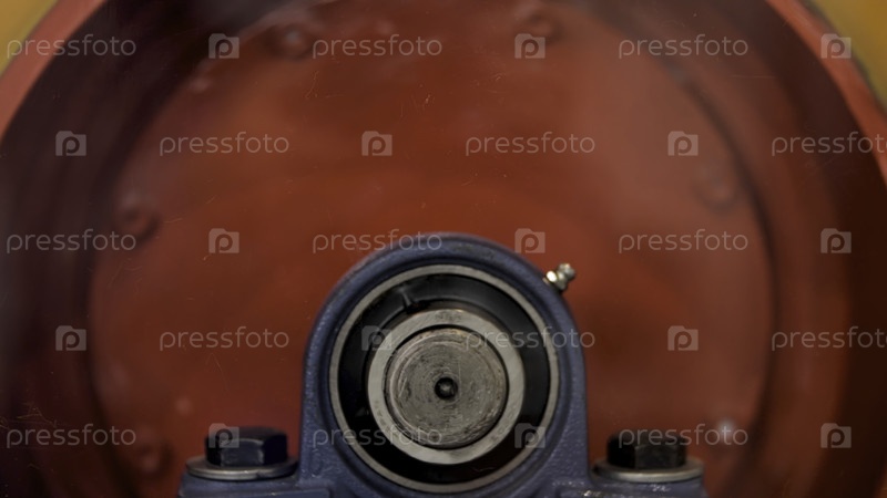 Ближайшее изображение вращающегося металлического механизма, концепция тяжелой промышленности и строительства СМИ Боковый вид движущегося круглого барабана красного цвета