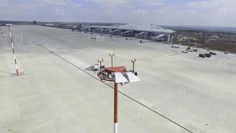 Вид из воздуха на современный терминал международного аэропорта. Путешествие по миру. Пустая аэродромная антенна. Вид на взлетно-посадочную полосу в аэропорту. Маркировка аэродрома на подъездной дороге направляется к взлетно-посадочной полосе