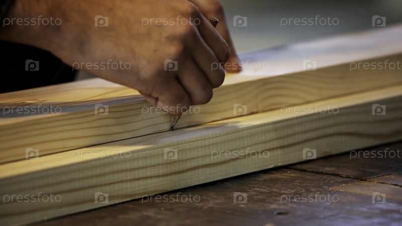 Опытный и умелый ремесленник тщательно маркирует древесину для точных разрезов в детальной обстановке мастерской