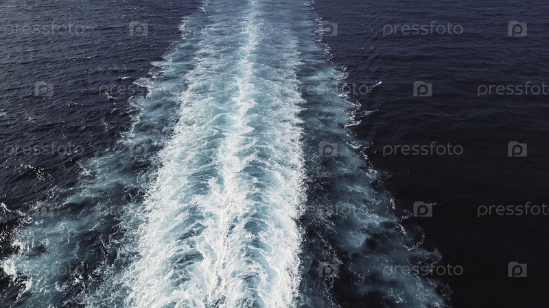 Живописный вид следа за большим круизным лайнером в море.Путь плавающего круизного судна с спокойным морем и ясным небом на Карибском море