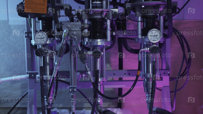 Близкий снимок автоматической промышленной стиральной машины на фабрике или мастерской. Действие. Панель управления и защиты