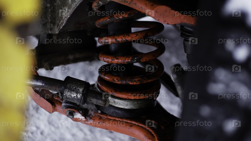 Весна в машине.Клип.Снежный пейзаж с запасной частью автомобиля, который снимается крупным планом.Высококачественная запись 4k