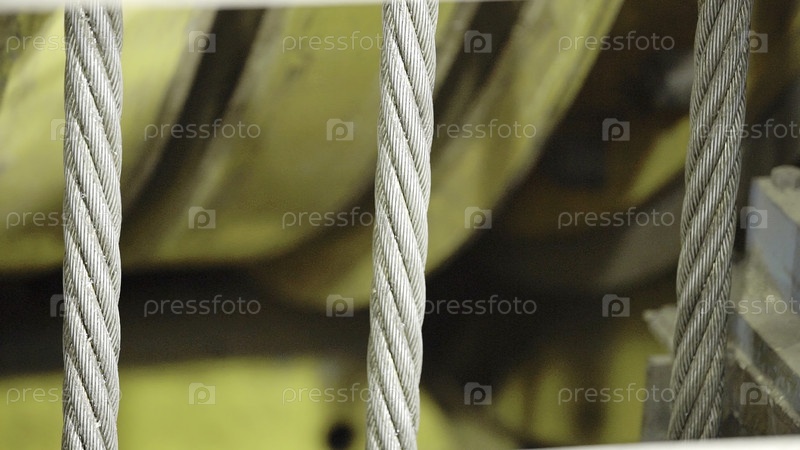 Близое изображение промышленного оборудования с помощью канатов и шкивов для тяжелого подъема в строительстве и производстве