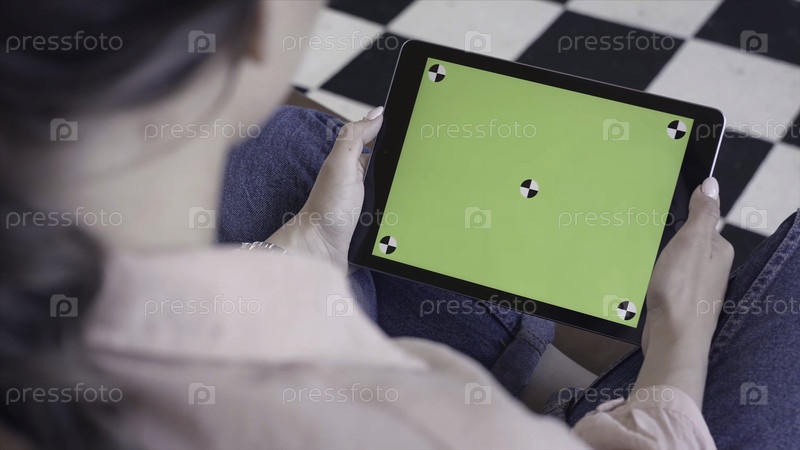 Близкий взгляд на молодую женщину, сидящую в кресле и смотрящую на планшет с зеленым экраном Chrome Key. Стоковые кадры. Chroma-экран для размещения собственного контента