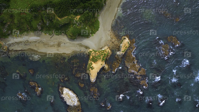 Вид сверху берега с скалами в воде и лесу. Клип. Удивительная природа побережья с красивыми скалами и чистой водой. Дикое побережье со скалами в бирюзовой воде и зеленым лесом в солнечный день