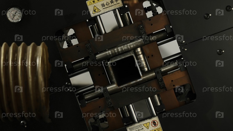 Современная машина с волоконным лазером CNC разрезает квадратную металлическую трубу, яркие горящие искры летают из лазерного луча во время процесса резки