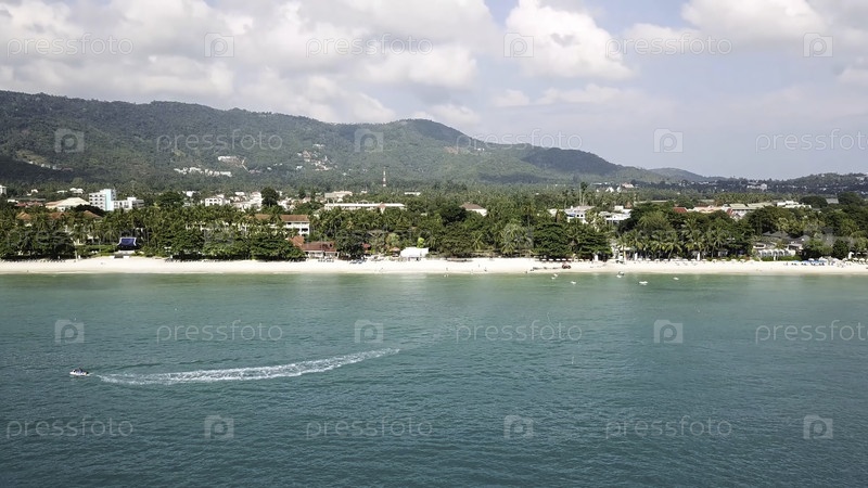 Вид с воздуха белого песчаного пляжа и реактивного лыжного спорта на аква-море голубой лагуны