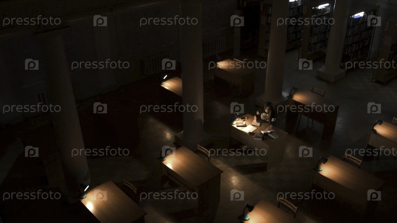 Девочка, сидящая в пустой библиотеке ночью