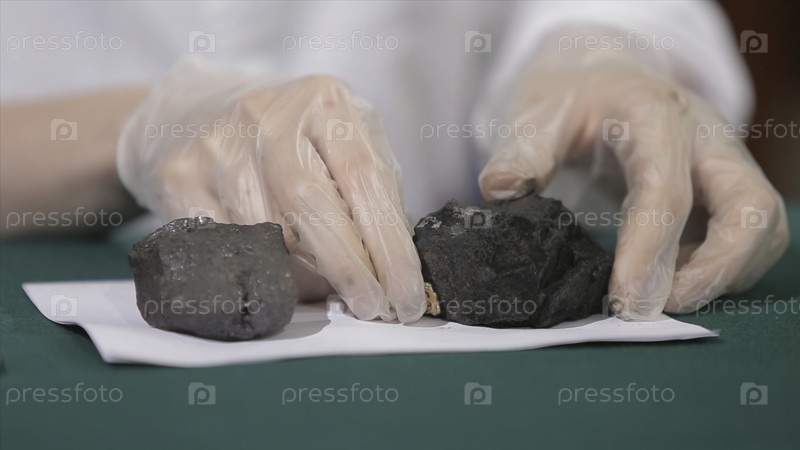 Мужские руки в перчатках, держащие уголь. Ученый с образцом угля. Черный уголь в руке шахтера