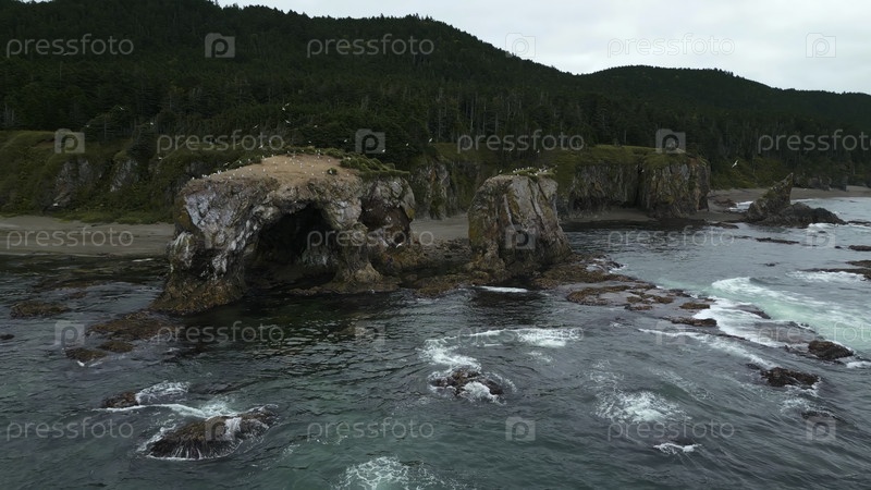 Вид сверху удивительного побережья с скалами и эрозией. Клип. Через скалы с летающими чайками на берегу моря. Фантастический пейзаж со скалами и чайками на берегу Северного моря в пасмурный день