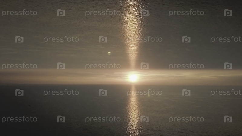 Красивый закат в море с эффектом зеркального горизонта.Вечернее солнце на горизонте со блесками, тема начала