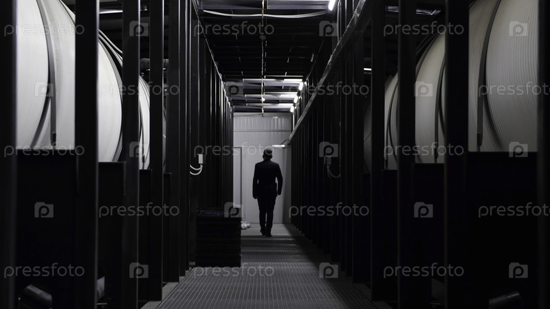 Темный интерьер внутри завода по переработке химических отходов. задний вид человека, идущего вниз по коридору возле резервуаров на химической фабрике, концепция экологии