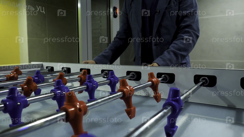 Бизнесмен играет в настольный футбол в офисе. Близкий план человека, играющего в настольный футбол в офисе. Концепция пребывания на работе