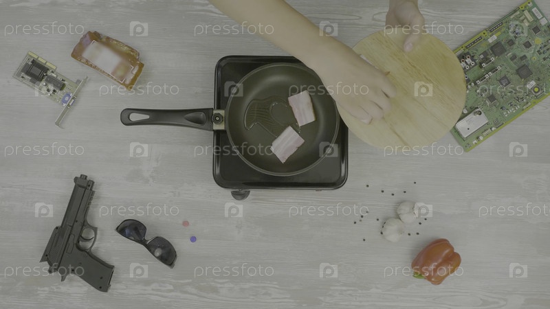 Человек готовит мясо в сковороде.Человек готовит ветчину в сковородке, на столе: пистолет, стаканы, чипсы и перец, абстракция для инстаграма тарелка