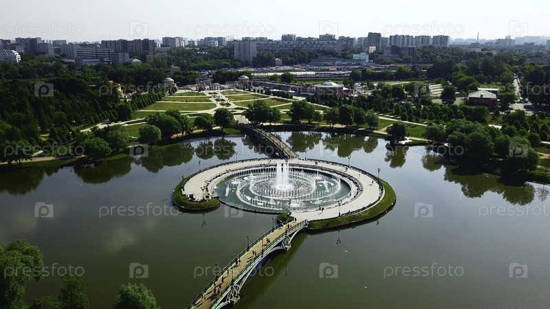 Вид сверху на фонтан в пруду и исторический дворец.Креативный.Удивительный фонтан в озере с пешеходными мостами в историческом дворце.Исторический комплекс с фонтанами, садами и зданиями