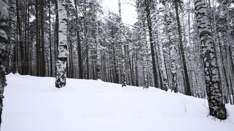 Прекрасный пейзаж с березовыми деревьями в зимнем лесу. СМИ. Зимний лес с березовыми деревьями и чистым снегом. Красивый лес с березовыми деревьями и успокаивающий эффект зимнего дня