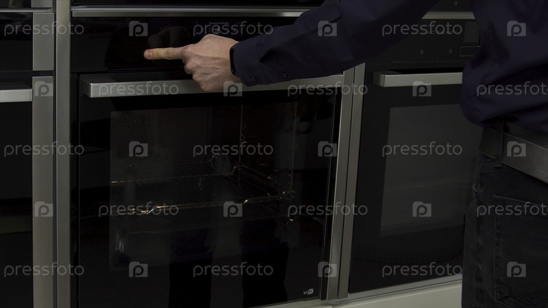 Ближайшее изображение человека, разблокирующего и открывающего новую современную мини-печь для кухни в мебельном магазине. Домашняя утварь. Презентация новой модели печи, высокотехнологичная концепция