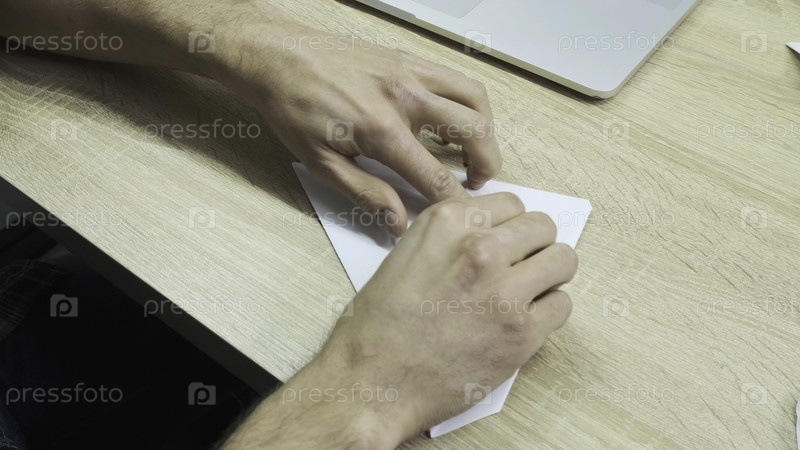 Вид сверху мужских рук, пытающихся сделать самолет из листа бумаги. Близкий план человеческих рук, практикующих оригами на фоне деревянного стола