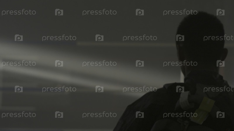 Человек с рюкзаком идет в старый спортивный зал, где дым и свет из крыши. молодой человек на старой заброшенной фабрике