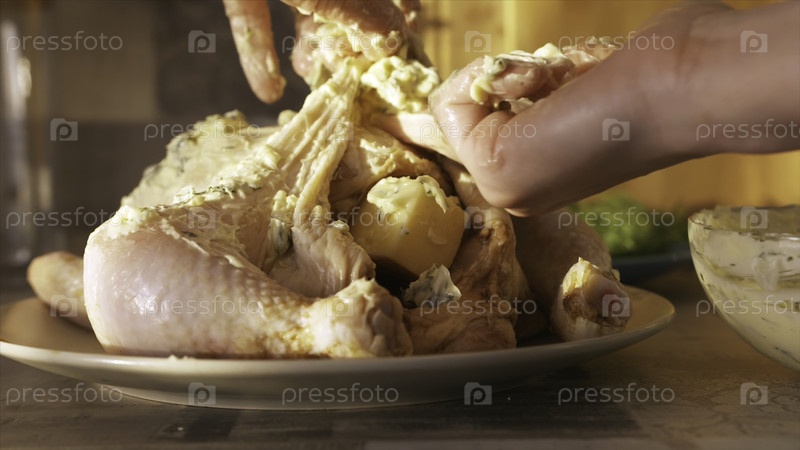Красная маринованная целая курица для выпечки в духовке. действие. ближайший снимок женщины, которая рукой наносит белый сливочный соус с зеленью и чесноком внутрь кур, концепция foodporn