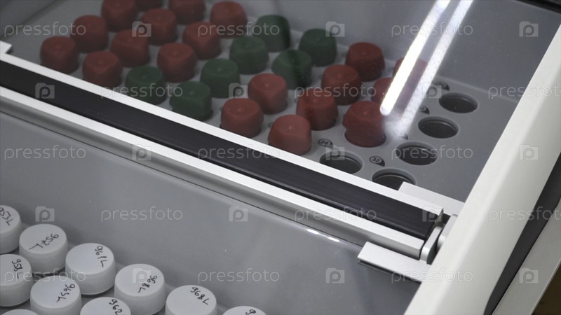 Испытательные трубки и бутылки расположены на медицинской тележке. клип. стойка испытательных трубок в медицинской лаборатории. лабораторные испытательные трубы в коробках-контейнерах без холодильника в исследовательских лабораториях