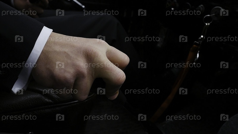 Бизнесмен едет на работу, рукой переключает коробку передач. Бизнесмен переключает трансмиссию в редкой машине. Бизнесмен управляет автомобилем, рукой переключая коробку передач. Ретро стиль
