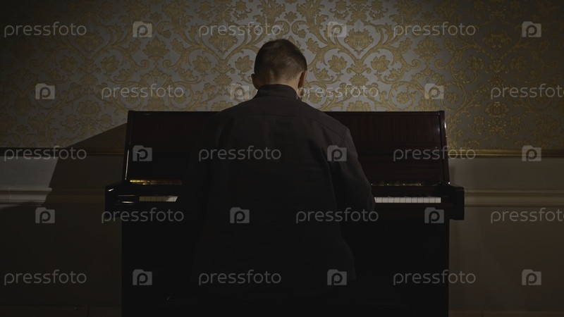 Молодой человек играет на старом фортепиано.СМИ.Задний вид молодого человека, играющего на пианино.Мужчина в костюме садится сыграть на старом фортепиано