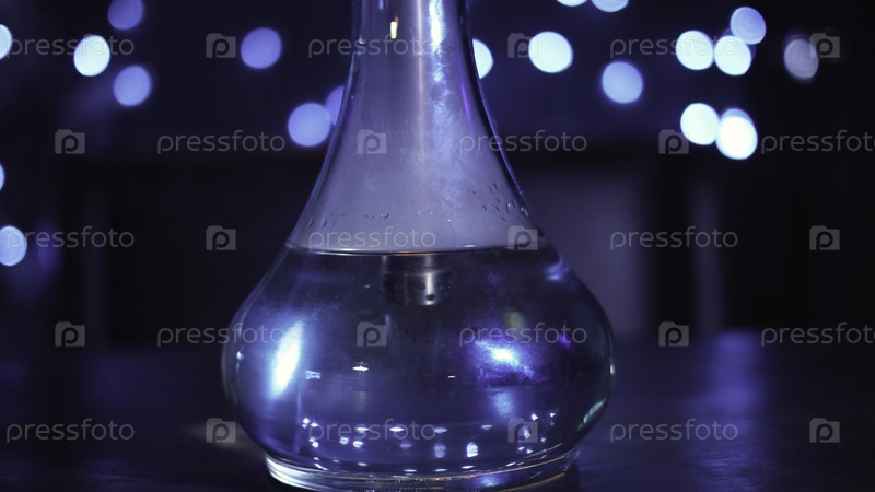 Стеклянная миска с кальяном на столе, традиционное восточное расслабление.СМИ. Закрытие прозрачной стеклянной колбы, заполненной водой и дымом в ночном клубе или баре