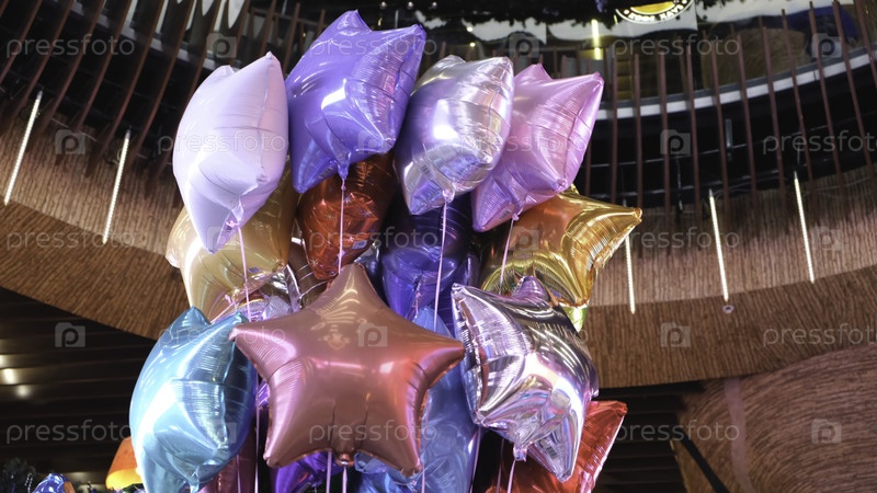 Вид снизу на красивые гелий цветные воздушные шары в форме звезд, установленные в каком-то здании. Концепция. Элементы украшения для праздников или торжеств